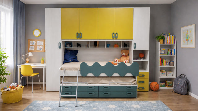 Cameretta Ponte 6 ante KIRI, VERDE PETROLIO E SENAPE, dal design moderno e lineare. Basket è una proposta innovativa e di ottima qualità per stanze non eccessivamente spaziose senza rinunciare allo stile. La cameretta ponte è composta da armadio 6 ante battenti dotato di comode maniglie, due letti, di cui uno estraibile, cassettiera e varie mensole per esporre libri e gli oggetti speciali dei tuoi figli. È una composizione essenziale e rassicurante, ideale per sfruttare al meglio ogni spazio, al giusto prezzo.