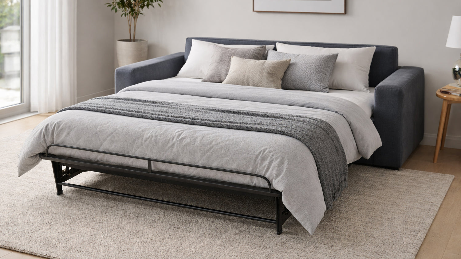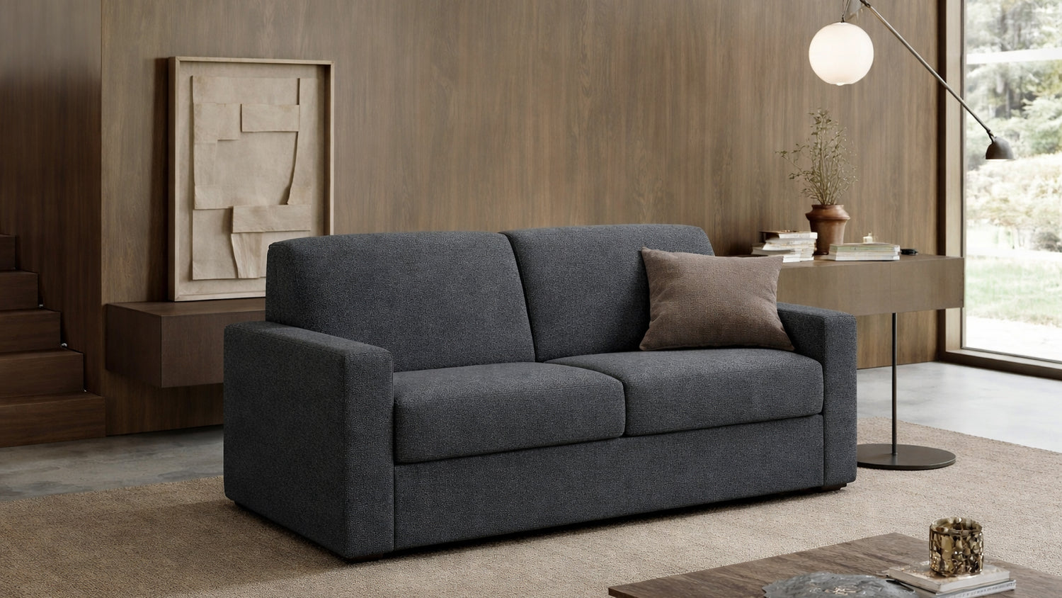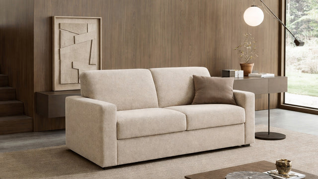 Norma si trasforma inoltre con semplicità in un letto confortevole, diventando una soluzione versatile per ospitare con praticità senza rinunciare allo stile.