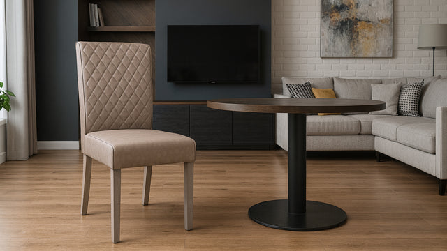 La nostra sedia Caro con schienale trapuntato rivestita in nabuk tortora è un capolavoro di design che aggiungerà un tocco di classe e comfort al tuo spazio.