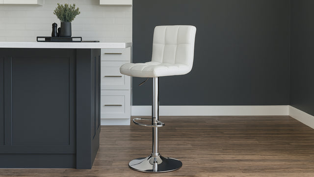 La seduta dello sgabello da bancone è imbottita e rivestita in similpelle di ottima qualità, 100% poliuretano, è una fodera elastica che rimane liscia anche in assenza di carico. Il rivestimento si presenta inoltre facile da pulire, sarà infatti sufficiente un panno di cotone inumidito in acqua tiepida per togliere eventuali macchie. Il piedistallo dello sgabello ergonomico presenta base a trombetta, completa di antigraffio, per proteggere i tuoi pavimenti.