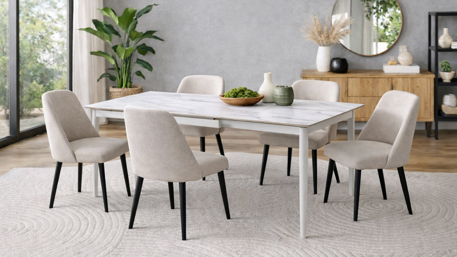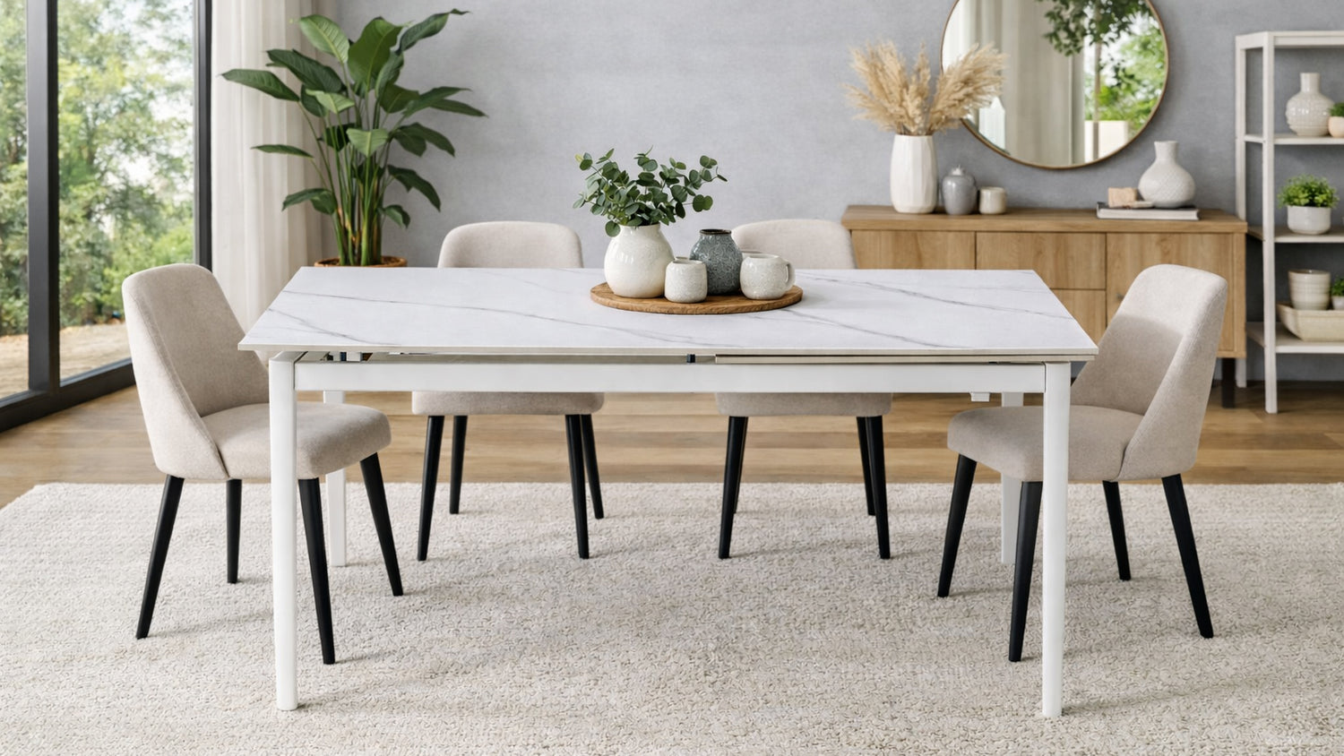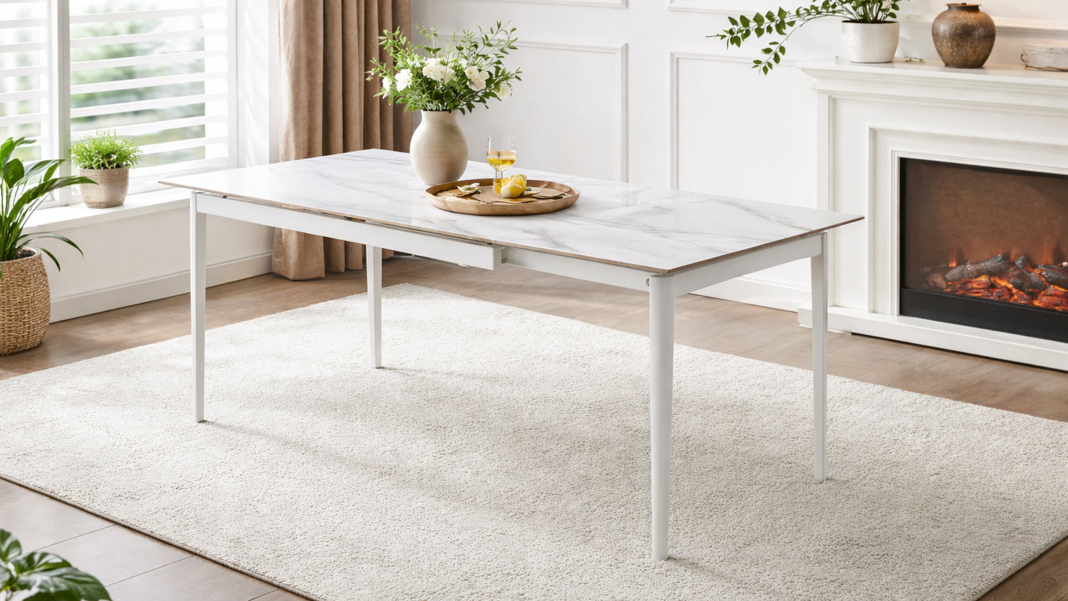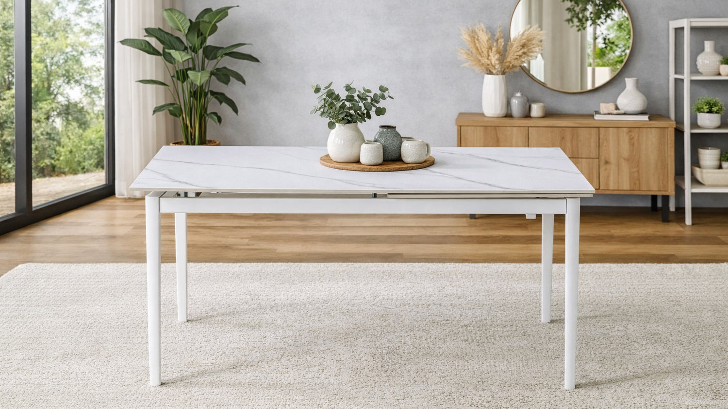 Il tavolo personalizzato adatto ai vostri desideri! Il suo piano in marmo bianco è originale e robusto. Può ospitare fino a 10/12 persone con 1 prolunga integrata da 40 cm, comoda e facile da usare. Passa da 140 a 180 cm. Il suo piano in marmo gli conferisce qualità eccezionali: resistenza agli urti, ai graffi, insensibile a varie macchie, e non teme le differenze di temperatura. I 4 piedini dritti in metallo nero garantiscono stabilità e finezza.