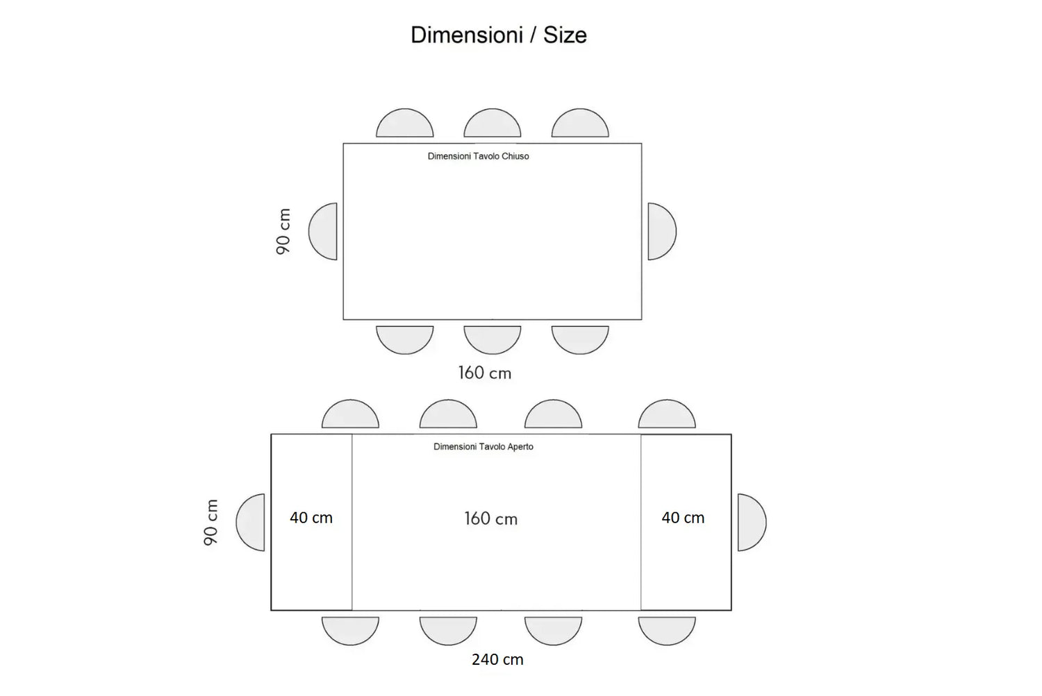 L. 160 (240 cm aperto) P. 90 H. 75 cm