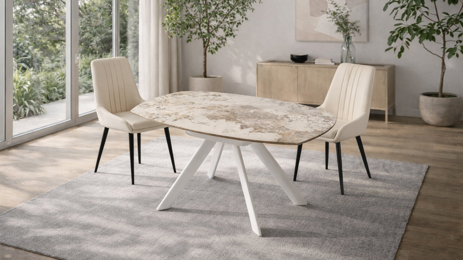 Formato da un piano in effetto marmo pandora, che diventa rotondo raggiungendo un diametro di 135 cm e da gambe in metallo verniciato bianco, ideale per la sala da pranzo e per il salotto.