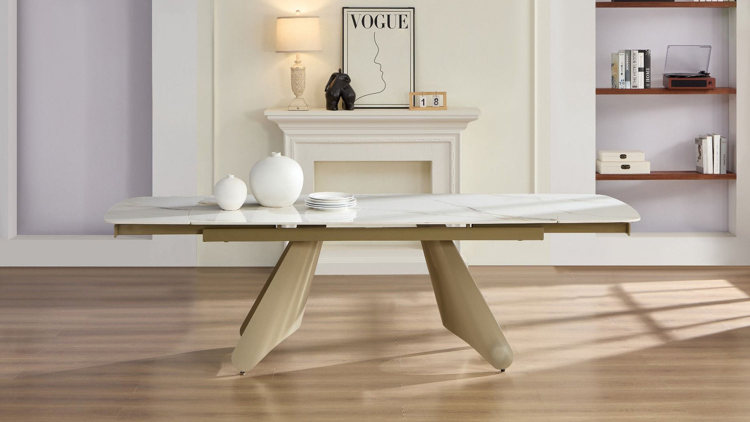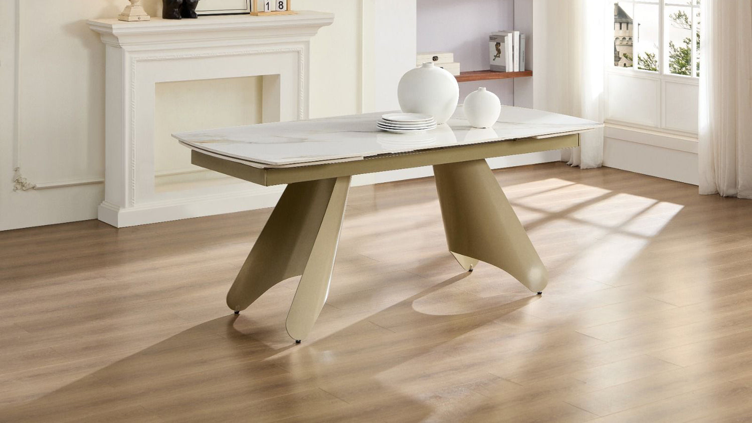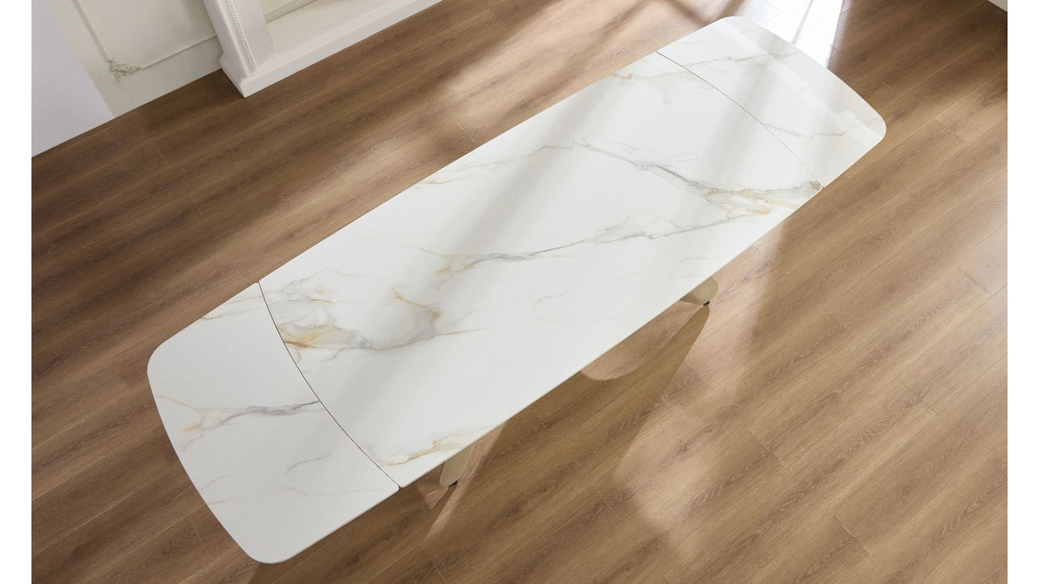 Eleganza e funzionalità si incontrano nel tavolo ovale Ulisse allungabile fino a 240 cm, perfetto per ambienti moderni e raffinati. Il top in ceramica Calacatta Gold lucido regala un effetto marmo sofisticato, mentre la solida gamba in ferro verniciato champagne aggiunge un tocco di stile esclusivo. Ideale per la sala da pranzo o il soggiorno, questo tavolo unisce design e praticità per impreziosire ogni spazio con classe.